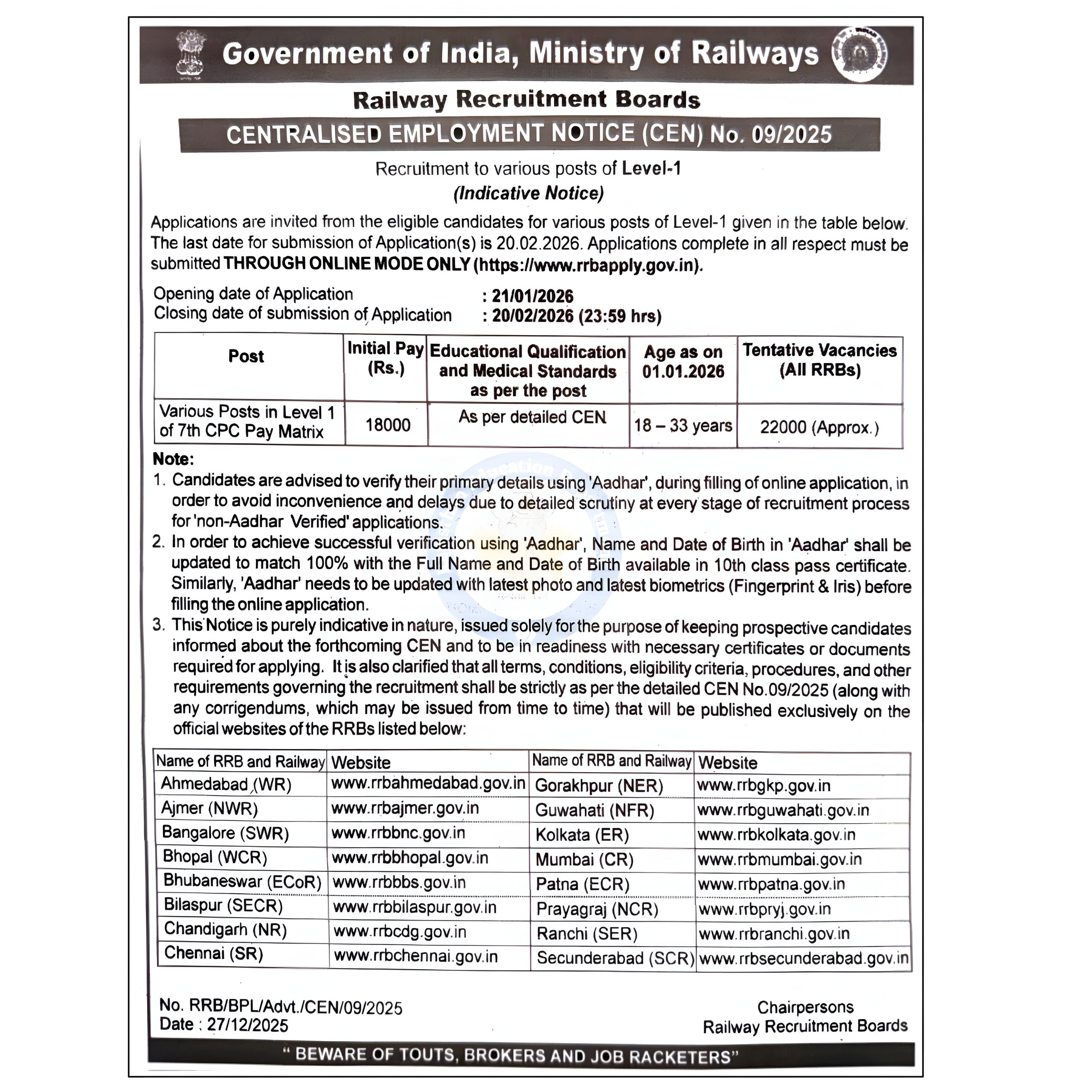 | Official Website | rrbchennai.gov.in, indianrailways.gov.in |